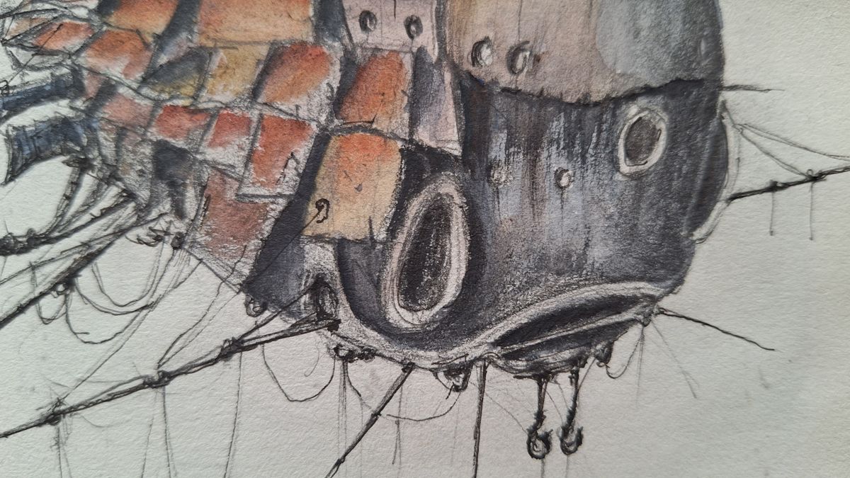 - Oxidized Ochre & Raw Sienna: Watercolor pigments that bathe the metal, suggesting the passage of time and exposure to dense, weary atmospheres.